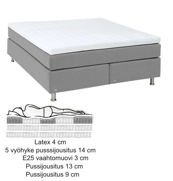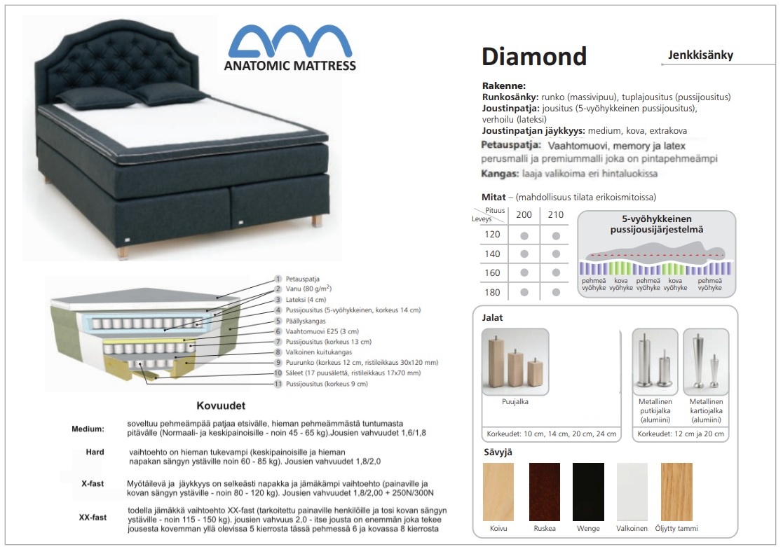 | 140 cm | 210 cm | 52 cm | cm | cm | cm | cm | cm | cm | cm | cm | cm | cm | cm | cm | cm | cm | cm | cm | cm | cm | cm | cm | cm | cm | cm | cm | 140x210 cm | Jenkkisängyn korkeus ilmoitettu ilman jalkoja ja sijauspatjaa | Medium, Kova, Extra kova, Extra Extra kova | cm | Alajousitus pussijousitus korkeus 9 cm, Alajousitus pussijousitus korkeus 13 cm, Jalat metallia, Jalat muovia, Vanu 80g/m2 | Jousiston yllä ja alla luonnonkumi 4 cm, Vanu 80g/m2, 5 vyöhykkeinen pussijousitus korkeus 14 cm | Ace Kangas, Monolith kangas, Perfect Harmony kangas, Storm kangas | Koivu, Metalli, Musta, Pyökki, Pähkinä, Tammi, Valkoinen | cm | Täystakuu tuotteelle 2 vuotta | Tilaustuote | 64 kg | Viro | cm | cm | cm | Saatavana erikoismittaisena kysy lisää asiakaspalvelusta. |