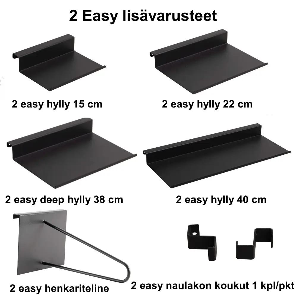 2 Easy sisustusseinä on suunniteltu monikäyttöiseksi, ja erilaisten lisävarusteiden avulla voit räätälöidä sen juuri omiin tarpeisiisi sopivaksi. Se soveltuu erinomaisesti keittiöön, kylpyhuoneeseen, eteiseen tai makuuhuoneeseen, tarjoten käytännöllisiä säilytys- ja ripustusratkaisuja tyylikkäässä muodossa.