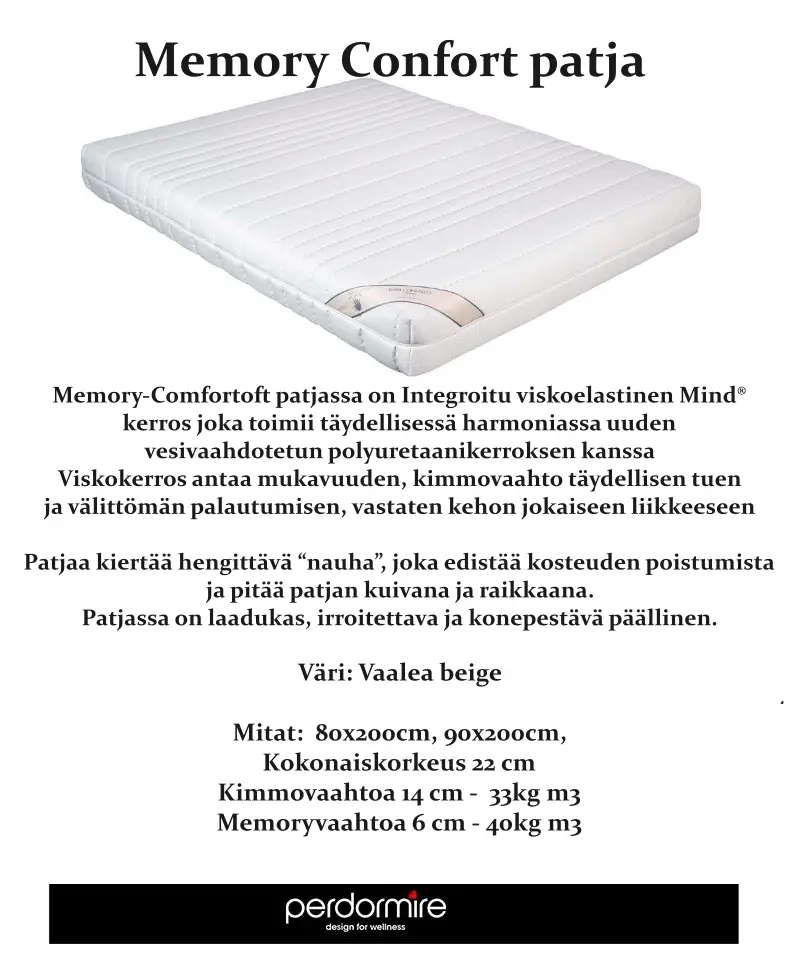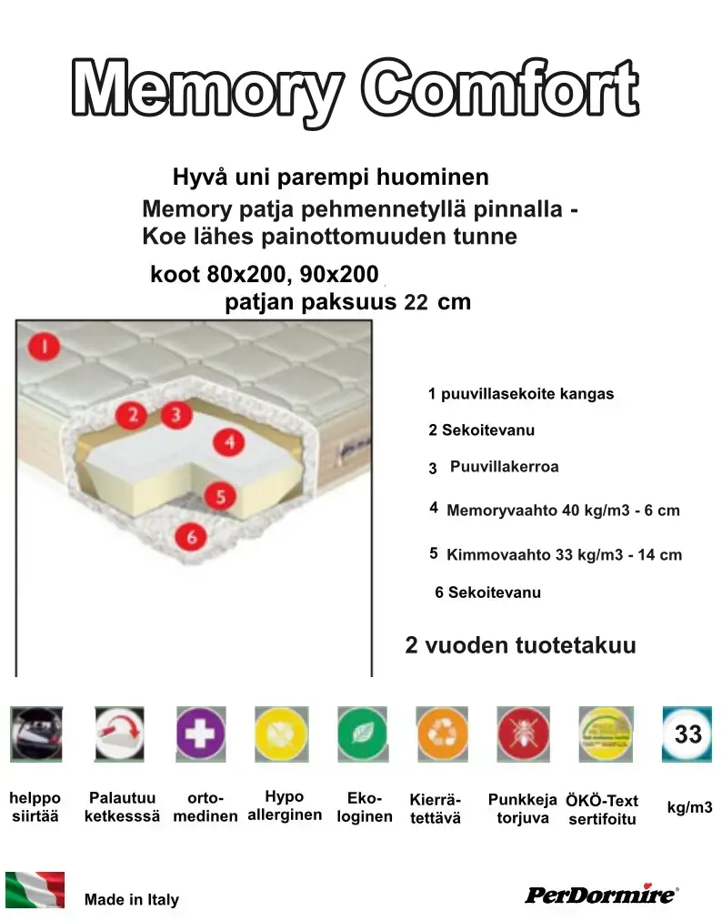 | 80 cm | 200 cm | 22 cm | cm | cm | cm | cm | cm | cm | cm | cm | cm | cm | cm | cm | cm | cm | cm | cm | cm | cm | cm | cm | cm | cm | cm | cm | 80x200 cm | Vaahtomuovipatjan korkeus ilmoitettu ilman sijauspatjaa | cm | Memory älyvaahtopehmuste, Pinnassa ilmavuutta tuova pintavanu, Punkkeja torjuva, Vetoketju 3 sivulla | Luonnonvalkoinen | cm | Takuu 2 vuotta | Tilaustuote | Toimitetaan rullalle pakattuna. Paketista avaamiseen jälkeen menee n. vuorokausi että patja palautuu muotoonsa | kg | Italia | cm | cm | cm |