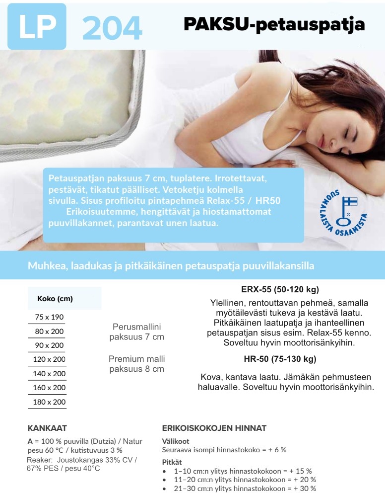 Patja on saatavana 12 cm tai 15 cm paksuisena, ja siihen voi lisätä ohuen tai ylellisen paksun sijauspatjan täydellistä mukavuutta varten. Erikoiskoot onnistuvat tilauksesta, ja asiakaspalvelumme auttaa sopivan vaihtoehdon valinnassa. Tämä kotimainen patja yhdistää mukavuuden, kestävyyden ja helpon huollettavuuden.