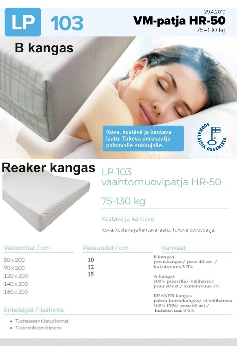 Kotimainen LP103 vaahtomuovipatja on kestävä ja jämäkkä valinta, joka tarjoaa tukea, hengittävyyttä ja kotimaista laatua jokaiselle nukkujalle. Patja sopii 75–130 kg painaville nukkujille, ja siitä on saatavilla myös erikoiskokoja tilauksesta.