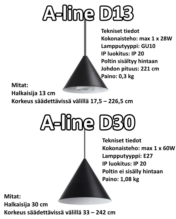 Metallirakenteinen A-line riippuvalaisin on suunniteltu kestävään käyttöön ja sisätiloihin (IP20). Pienempi D13-malli sisältää GU10 LED-polttimon, kun taas suurempi D30-malli käyttää E27-polttimoa, mikä antaa vapautta valita juuri halutun valon sävyn ja tehon.
