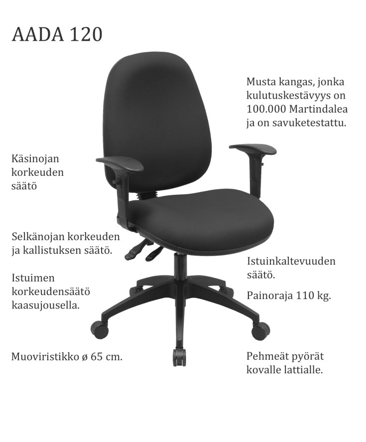 AADA 120 -työtuoli on suunniteltu toimisto- ja kotikäyttöön, ja sen monipuoliset säädöt auttavat löytämään juuri oikean työasennon. Kaasujousella toimiva korkeudensäätö, selkänojan korkeudensäätö sekä istuinkaltevuuden säätö mahdollistavat yksilöllisen ergonomian.