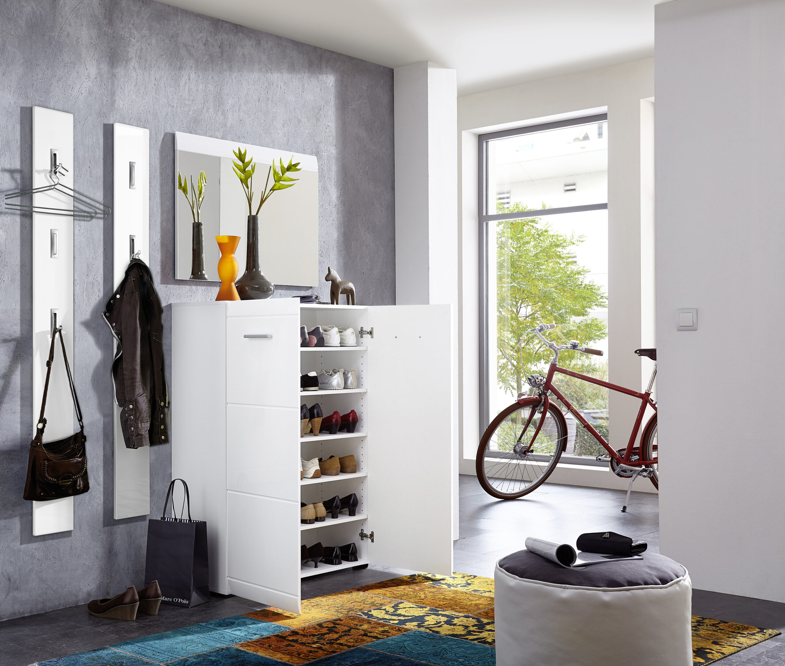 Adana kenkäkaappi 3524 yhdistää korkeakiiltoisen valkoisen pinnan ja modernit yksityiskohdat, luoden raikkaan ja elegantin ilmeen mihin tahansa eteiseen. Sen selkeälinjainen design tekee kokonaisuudesta ilmavan ja ajattoman.