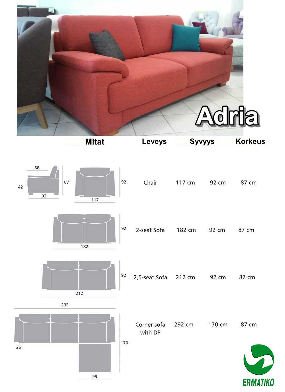 | 117 cm | 92 cm | 87 cm | cm | cm | cm | cm | 42 cm | cm | 58 cm | cm | cm | cm | cm | cm | cm | cm | cm | istuintyyny vaahtomuovi 35HR | Jämäkkä selkänojatyyny, Vaahtomuovi HR25, Silikonikuitu | cm | cm | cm | cm | cm | cm | cm | cm | cm | cm | Jalat massiivipuuta, Massiivipuu, Vaneri | Ermatiko värit | cm | Täystakuu tuotteelle 2 vuotta | Tilaustuote | Toimitus koottuna - jalkojen kiinnitys | kg | Viro | cm | cm | cm |
