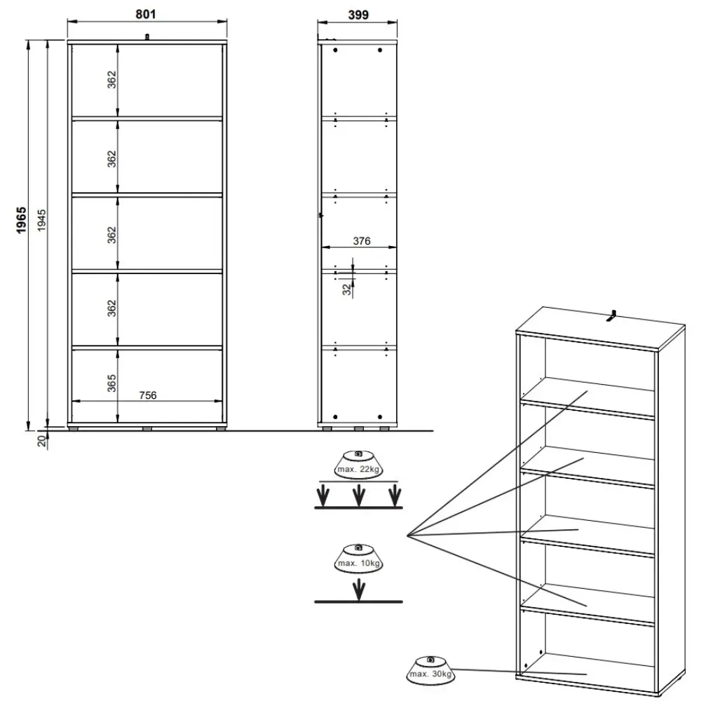 MDF-materiaali, melamiinihartsipinnoite ja vahvat ABS-reunanauhat takaavat erinomaisen kestävyyden ja pitkäikäisen käytön. Hylly toimitetaan osina tai valmiiksi koottuna lisähinnasta, ja sen mitat (80 × 40 × 197 cm) sekä 52,4 kg paino tuovat tukevuutta ja laatua.