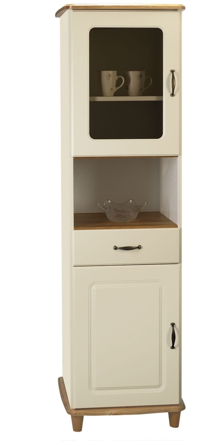 Astiakaapissa on lasiovellinen yläkaappi, kapea avohylly, vetolaatikko metallisilla liukukiskoilla sekä tilava alakaappi. Näiden ansiosta kaappi tarjoaa runsaasti säilytystilaa niin astioille, koriste-esineille kuin kodin pienille tarvikkeillekin – kaikki käden ulottuvilla ja siististi järjestyksessä.