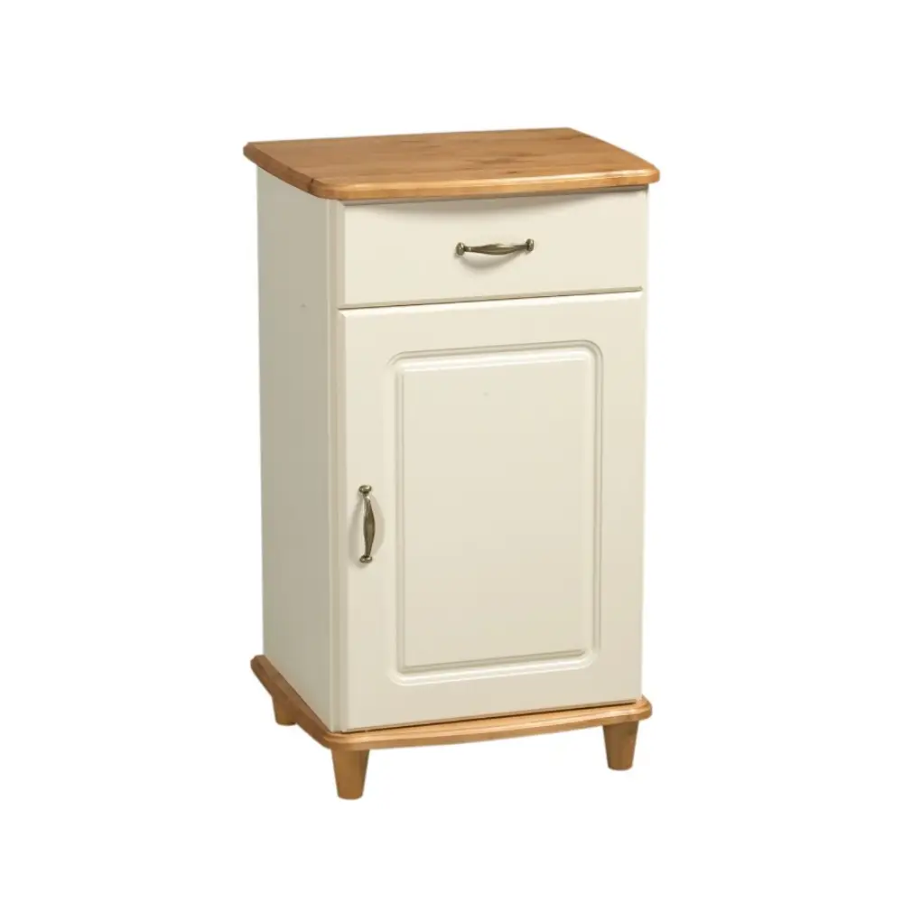 Kestävä 19 mm:n maalattu MDF-runko ja 20 mm:n petsatusta massiivimännystä valmistetut kansi ja pohja takaavat pitkän käyttöiän. Yksi metallikiskoilla varustettu laatikko ja kaappi kahdella hyllyllä tarjoavat runsaasti säilytystilaa kompaktissa ja tyylikkäässä muodossa.