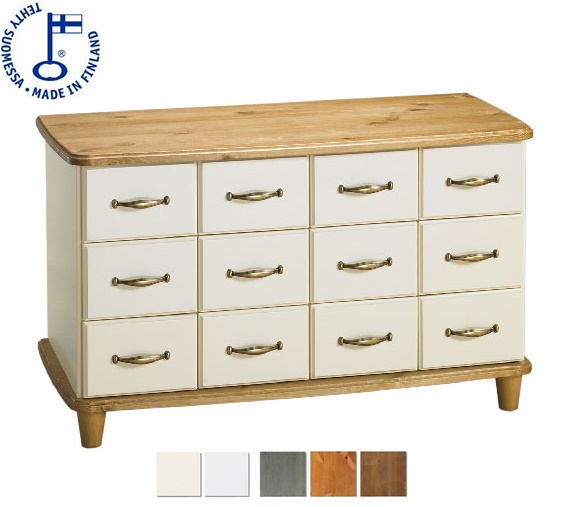 - Korkealaatuinen kotimainen Aina tuotesarjan laatikosto 12 laatikolla, jossa metalliset liukukiskot. Aino tuotesarjaa on saatavana useana väriyhdistelmänä ja kahdella eri vedinvärillä. Tuote toimitetaan osina.