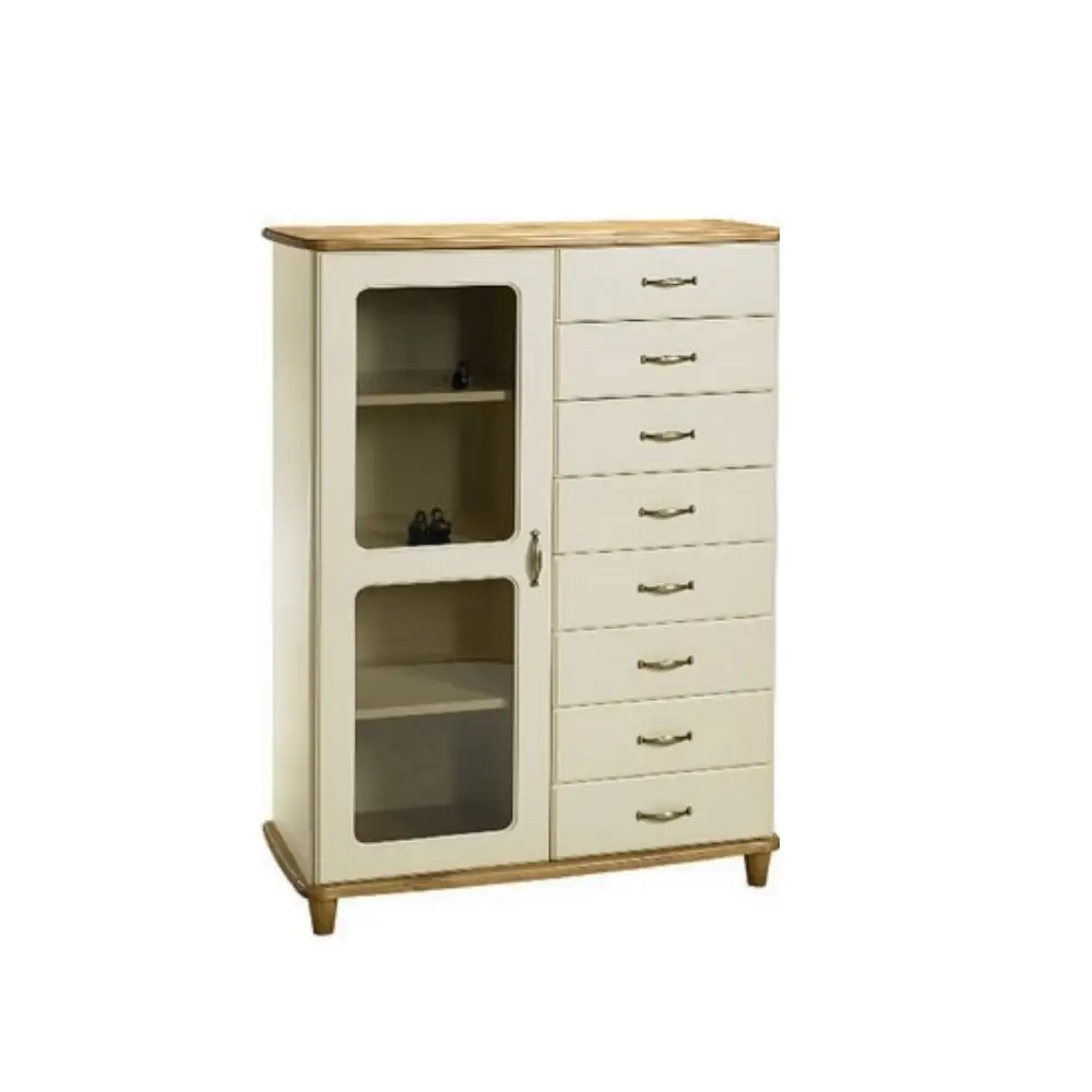 Lipastokaappi tarjoaa runsaasti tilaa säilytykseen: yksi lasiovi ja kahdeksan metallikiskoilla varustettua laatikkoa pitävät tavarasi siististi järjestyksessä ja helposti saatavilla. Sen monikäyttöinen rakenne sopii niin olohuoneeseen, makuuhuoneeseen kuin työtilaankin – kaikkialle, missä kaivataan tyylikästä ja toimivaa säilytystä.