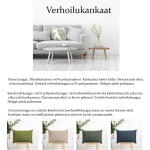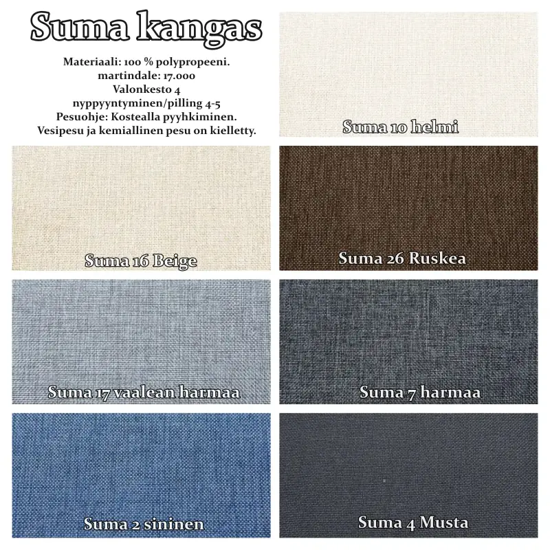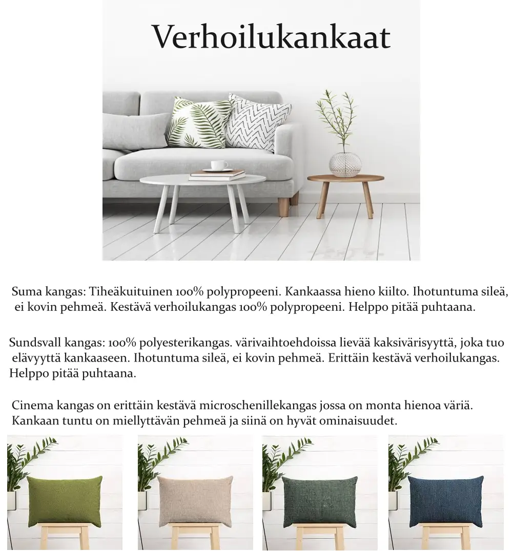 Verhoiluvaihtoehtoina ovat laadukkaat ja kestävät kankaat, kuten tiheäkuituinen Suma, eläväpintainen Sundsvall sekä pehmeä ja erittäin kestävä Cinema-chenille. Saatavilla on myös muita kangasvaihtoehtoja, kuten kuvioitu Alknis-kangas – kysy lisää asiakaspalvelustamme ja räätälöi nojatuoli juuri omaan kotiisi sopivaksi.