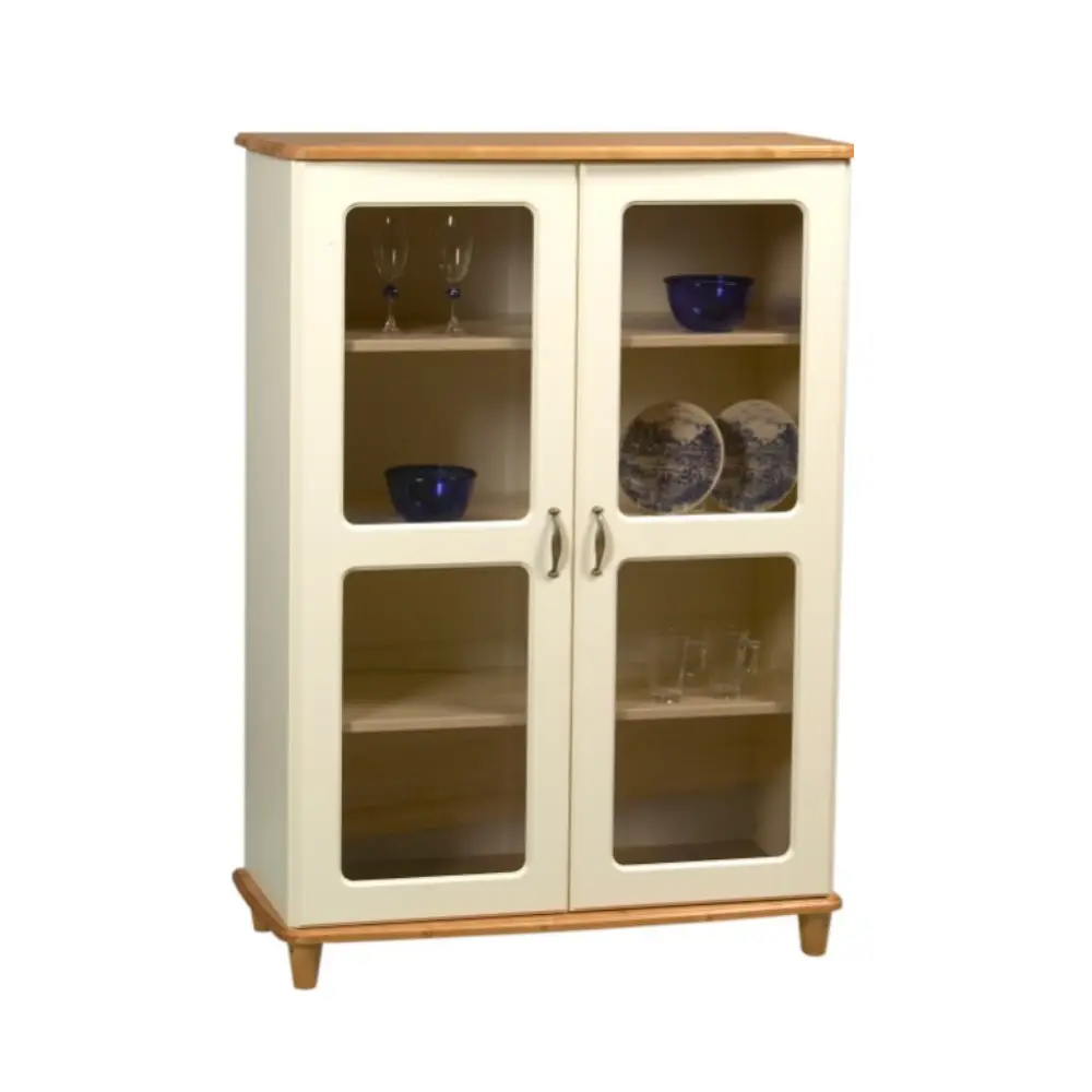 Vitriinin runko on valmistettu 19 mm:n maalatusta MDF:stä, ja kansi sekä pohja 20 mm:n petsatusta massiivimännystä, joka tuo kalusteeseen luonnollista lämpöä ja arvokkuutta. Voit valita rungon väriksi valkoisen tai vaniljan ja yhdistää sen antiikin, pähkinän tai harmaan sävyiseen kanteen ja jalkoihin. Viimeistele kokonaisuus tyylikkäillä vetimillä, jotka ovat saatavilla antiikkimessingissä tai mattakromissa – valinta, joka korostaa vitriinin hienostunutta viimeistelyä.