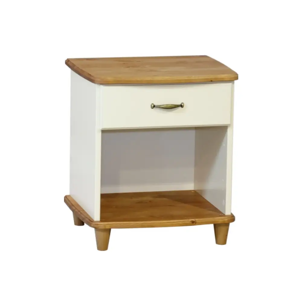 Yöpöydän runko on valmistettu 19 mm:n maalatusta MDF:stä, ja sen kansi sekä pohja 20 mm:n petsatusta massiivimännystä. Tämä yhdistelmä takaa vankan ja pitkäikäisen rakenteen. Yksi metallikiskoilla varustettu laatikko tarjoaa kätevää säilytystilaa, ja kompaktit mitat (leveys 51 cm, syvyys 43 cm, korkeus 53,5 cm) tekevät siitä täydellisen valinnan myös pienempiin tiloihin.