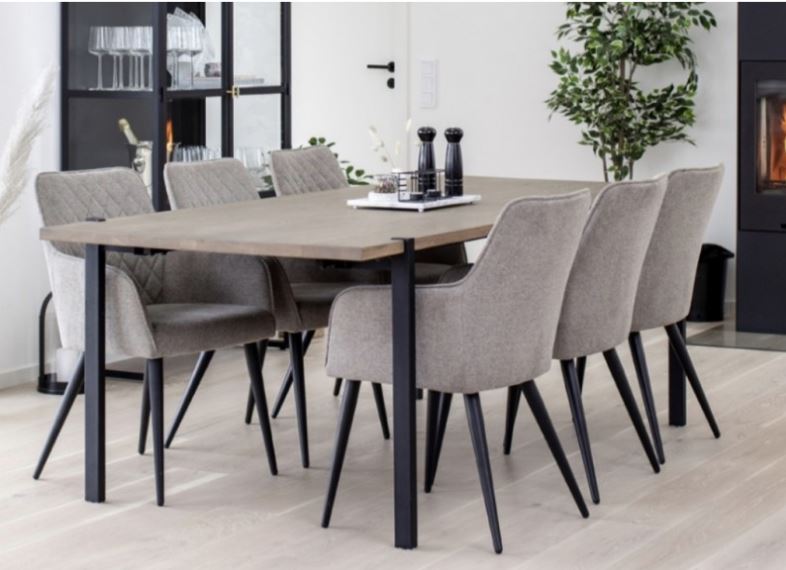 Aki – moderni harmaapetsattu ruokapöytä on suunniteltu koteihin, joissa arvostetaan selkeitä linjoja, rauhallista värimaailmaa ja kestävää laatua. Harmaapetsattu tammikansi yhdistettynä mustiin metallijalkoihin luo tyylikkään kontrastin, joka tuo ruokailutilaan ryhtiä ja modernia eleganssia. MDF:n, tammen ja metallin yhdistelmä tekee pöydästä tukevan ja pitkäikäisen valinnan.