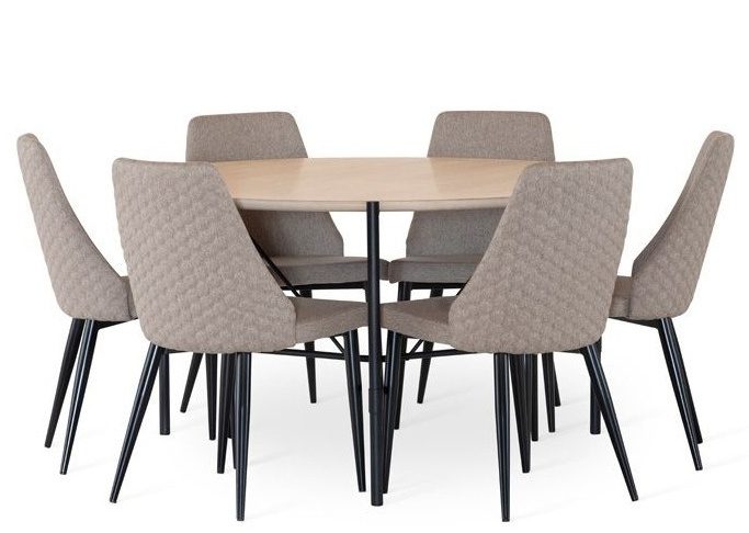 Pöydän MDF- ja tammirakenne yhdistettynä metallijalkoihin takaa tukevuuden ja pitkän käyttöiän. Harmaat Flair-tuolit on verhoiltu miellyttävällä kankaalla ja niiden siro metallirunko täydentää kokonaisuuden modernia ilmettä. Pyöreä 135 cm pöytä tarjoaa mukavasti tilaa neljälle hengelle ilman tilan tuntua kaventavaa vaikutelmaa.