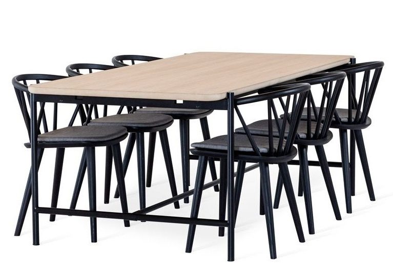 Tyylikäs Ale ruokailuryhmä yhdistää valkoöljytyn tammipöydän ja kuusi Edda-tuolia harmoniseksi ja skandinaavisen selkeäksi kokonaisuudeksi. Mustat metallijalat tuovat pöytään ryhdikkään kontrastin, joka sopii erinomaisesti moderniin ja ajattomaan sisustukseen.
