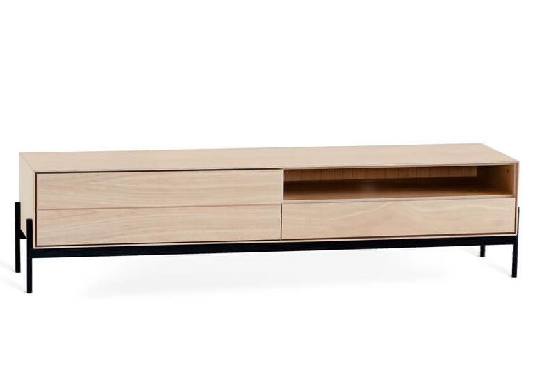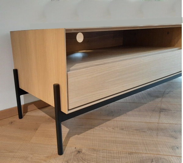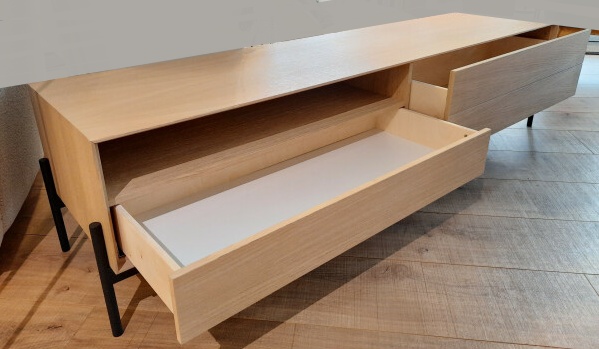 TV-tasossa on vasemmalla avohylly ja laatikko sekä oikealla kaksi tilavaa laatikkoa, jotka tarjoavat runsaasti säilytystilaa elektroniikalle, kaukosäätimille ja muille tarvikkeille. Kaikissa laatikoissa oleva push to open -mekanismi pitää kokonaisuuden selkeänä ja viimeistellyn minimalistisena ilman näkyviä vetimiä.
