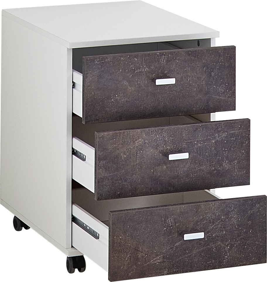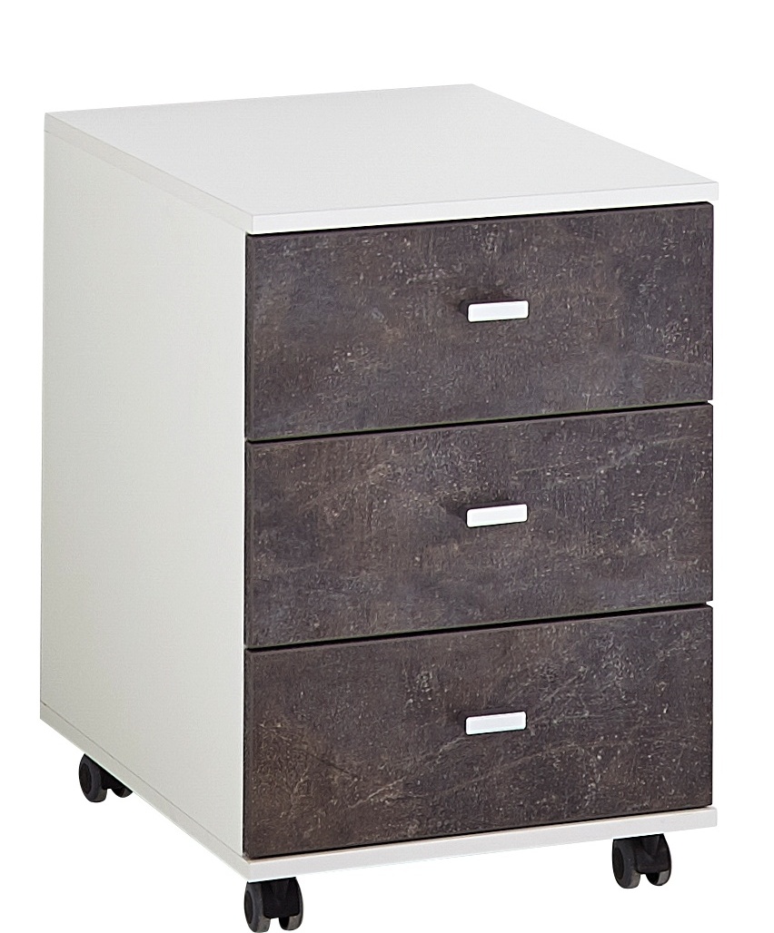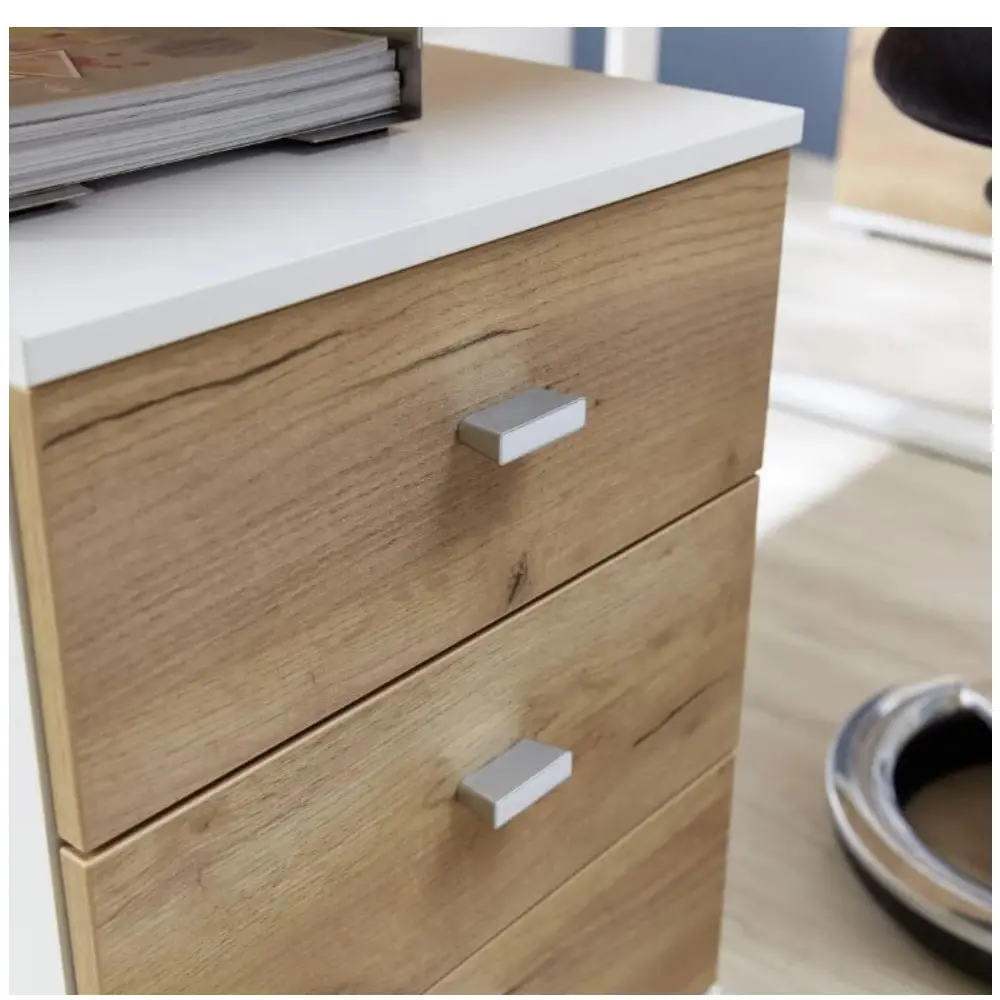 Kolme tilavaa laatikkoa tarjoavat runsaasti säilytystilaa asiakirjoille, toimistotarvikkeille ja muille arjen tavaroille. Basaltti- tai Navarra tammen sävyiset etusarjat luovat näyttävän kontrastin valkoiseen runkoon ja tuovat lipastoon modernin, elegantin ilmeen.