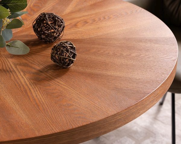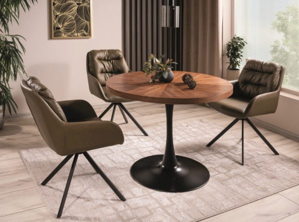 • Käytännöllinen pyöreä ruokapöytä soveltuu hyvin pienempäänkin tilaan. Pöydässä tukeva metallijalka sekä pähkinänsävyinen kansi. Toimitus osissa.