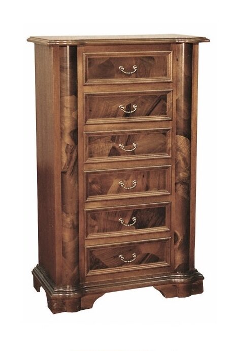 Massiivipuu ja MDF-levy takaavat lipaston tukevuuden, kun taas aito juurikuviopinta kiiltävällä lakkauksella luo ylellisen ja ajattoman ilmeen. Hopea- tai messinkivetimet viimeistelevät kokonaisuuden ja tuovat siihen ripauksen italialaista hienostuneisuutta.
