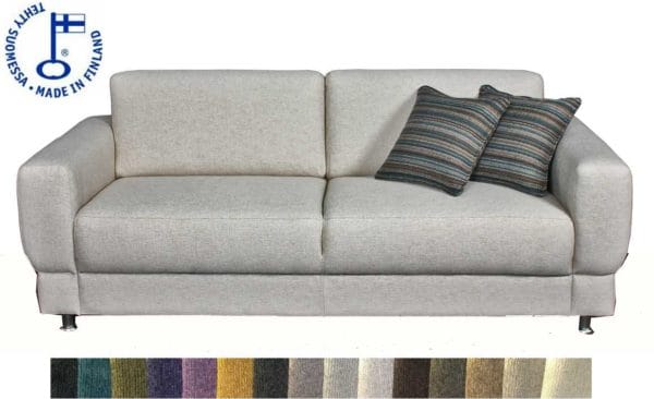 - Laadukas Suomessa valmistettu modernin muotoilun omaava 3 istuttava Amos sohva jossa kiinteä verhoilu. Istuin kovuus napakka. Valmistettu laadukkaista ja kestävistä materiaaleista. Tuote toimitetaan metallijaloilla mutta saatavana myös petsatuilla koivujoloilla.
