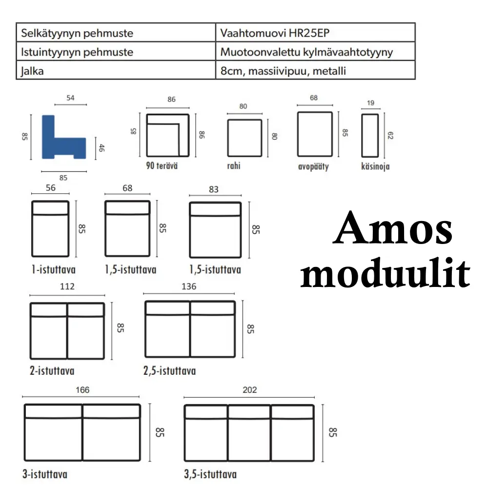 Amos moduulisohva tarjoaa muokattavan ja kotimaisista laatumateriaaleista valmistetun kokonaisuuden, jonka voit rakentaa eri moduuleista ja verhoiluista juuri omaan kotiisi sopivaksi. Ryhdikäs ja kimmoisa istuintuntuma sekä laaja kangas- ja nahkavalikoima tekevät siitä tyylikkään ja pitkäikäisen sisustusratkaisun.