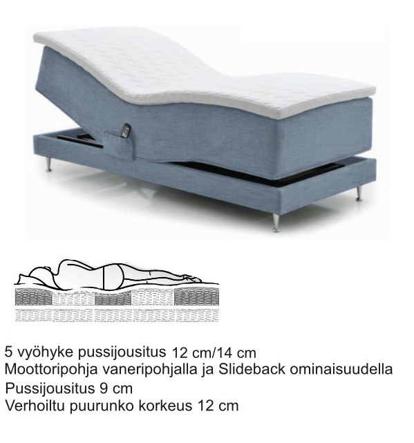 Flex II -moottorisänky on valinta sinulle, joka haluat nukkumiselta enemmän. Älykäs Slideback-toiminto siirtää sänkyä automaattisesti taaksepäin pääpäätyä nostettaessa, säilyttäen ergonomisen asennon ja lisäten käyttömukavuutta. Jämäkkä massiivipuurunko, 5-vyöhykkeinen pussijousitus sekä HR35-vaahtomuovi jousiston päällä ja alla takaavat optimaalisen tuen ja pitkäikäisyyden.