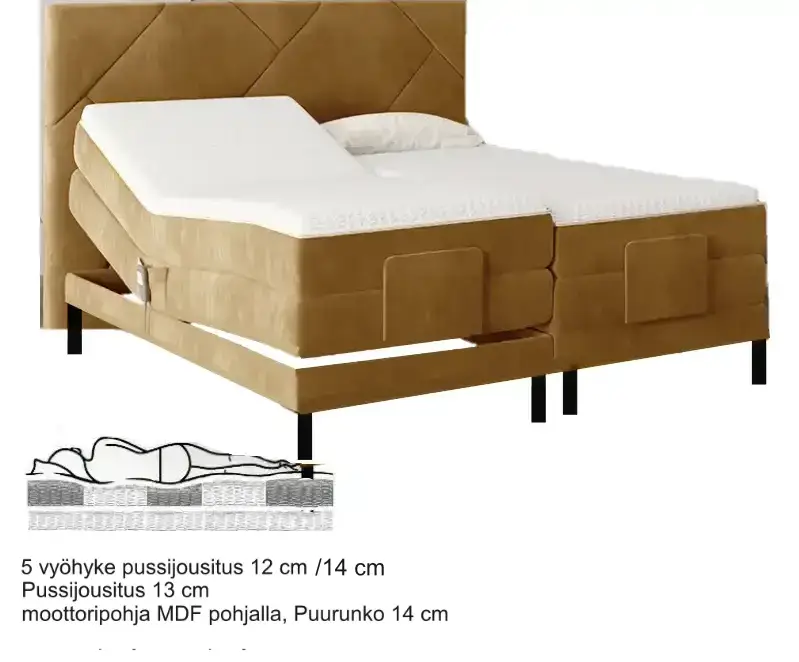 Sol-moottorisänky on valinta sinulle, joka etsit markkinoiden parasta yhdistelmää mukavuutta, tukea ja teknologiaa. Sängyn kaksitasoinen jousitus – 13 cm korkea pussijousitus moottoripohjassa sekä 12 cm ergonominen, 5-vyöhykkeinen pussijousitus yläkerroksessa – mukautuu kehosi painopisteisiin täydellisesti. Lisäksi voit valita sängyn pintapehmeyden neljästä vaihtoehdosta, kuten viskoelastisesta muistivaahdosta tai luonnonkumista, ja säätää asentoa langattomalla kaukosäätimellä helposti juuri itsellesi sopivaksi.