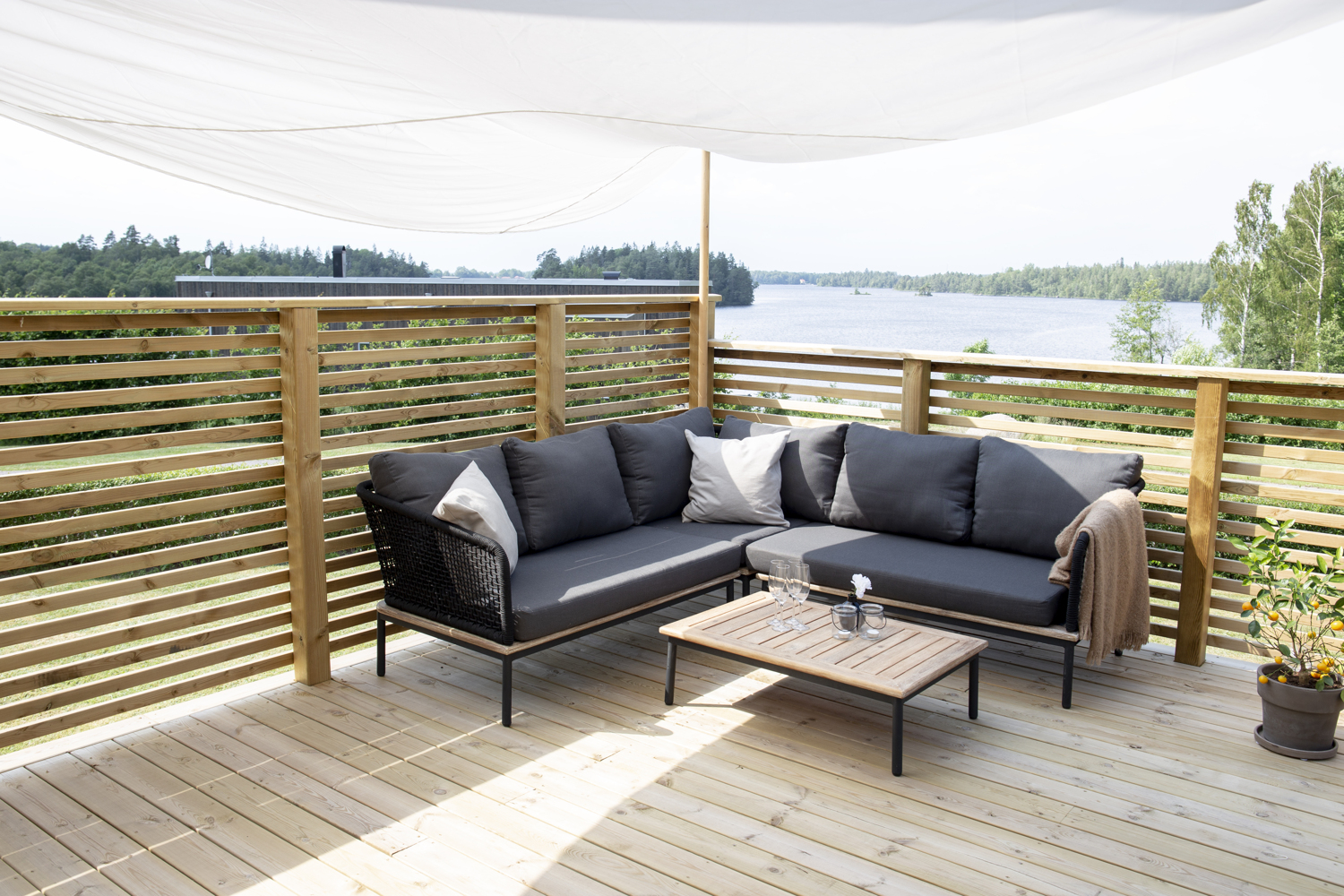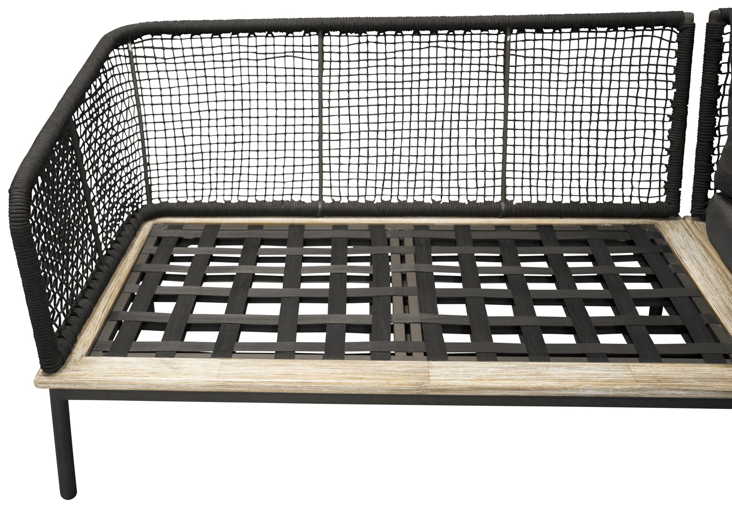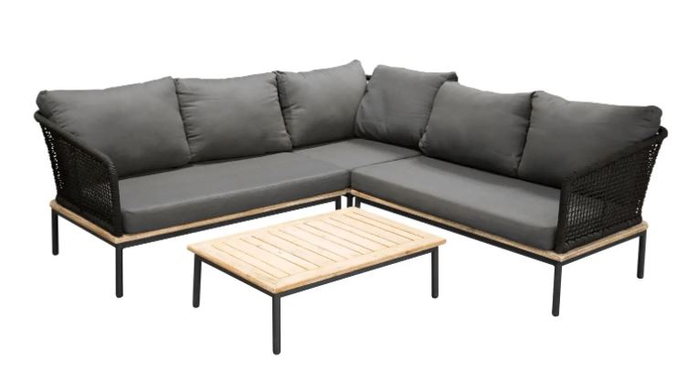 Sohvaryhmä koostuu kulmasohvasta, sekä matalasta sohvapöydästä. Sohvan ja pöydän runko on mustaa jauhemaalattua metallia. Tyylikkäänä yksityiskohtana sohvassa on musta köysipunos sekä puureunus joka on samaa akaasiapuuta kuin sohvapöydän pöytälevy. Jotta ulkokalusteiden puuosat säilyttäisivät viimeistelynsä, ne tulee olla öljykäsitelty. Tämä ryhmä muodostaa yhdessä kauniin kokonaisuuden. Harmaat tyynyt sisältyvät tuotteeseen. Toimitus osissa.