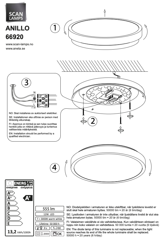 Anillo plafondissa on energiatehokas 12 W LED-valonlähde, joka tuottaa 555 lumenin kirkkauden ja lämpimän 3000K valonsävyn. Valon voimakkuutta voidaan säätää himmentimen avulla, mikä mahdollistaa juuri oikean tunnelman luomisen eri vuorokaudenaikoihin ja käyttötarkoituksiin.