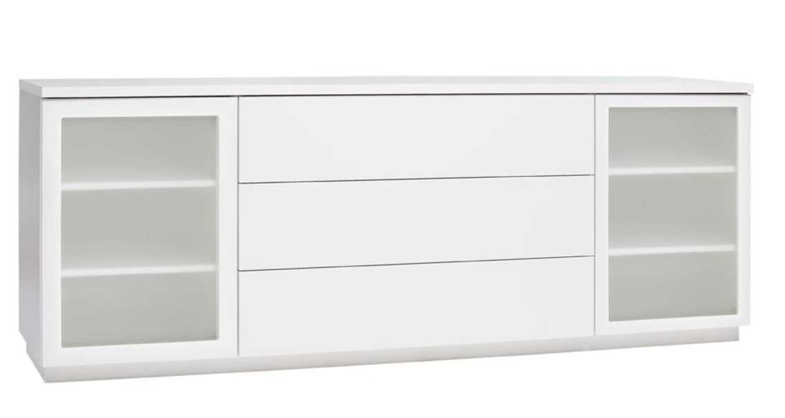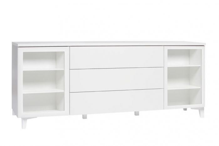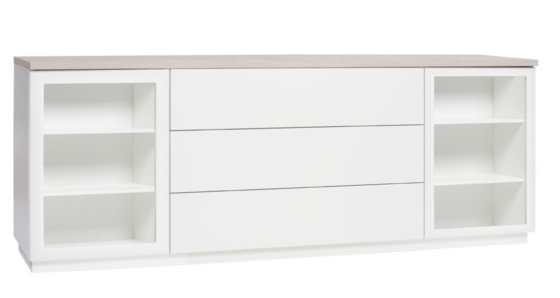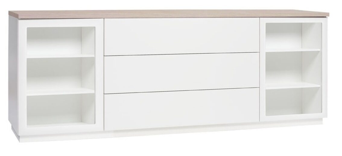 Senkissä on kaksi vitriinikaappia, joissa kummassakin on kaksi korkeussäädettävää hyllyä – valittavissa valkoisina tai lasihyllyinä. Ovet voidaan valita joko kirkkaalla tai maitolasisella lasilla, ja lisävarusteena saatavilla olevat valaisimet tuovat esille asetettujen esineiden kauneuden ja korostavat kalusteen modernia ilmettä. Keskiosan kolme tilavaa laatikkoa tarjoavat runsaasti säilytystilaa, ja ovien sekä laatikoiden push to open -mekanismi takaa vetimettömän, tyylikkään ja äänettömän käyttökokemuksen.