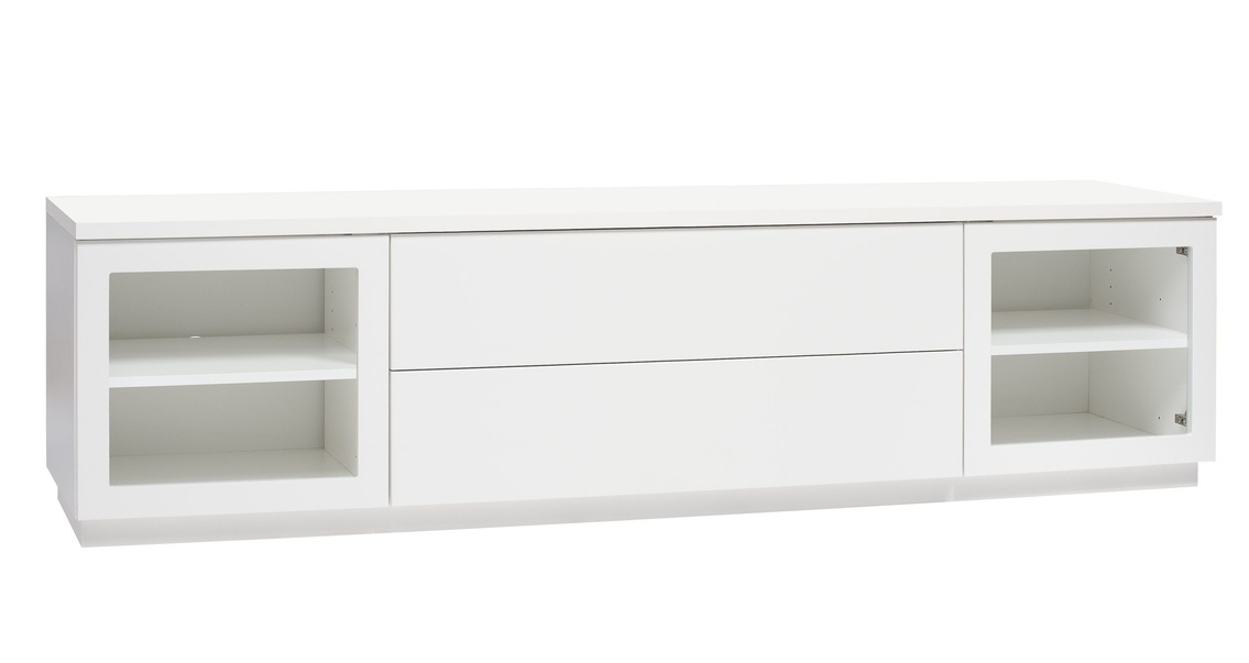 Tv-tasossa on kaksi kaappia korkeussäädettävillä hyllyillä sekä kaksi keskellä sijaitsevaa laatikkoa, joissa on laadukkaat push-open -mekanismit. Ratkaisu tarjoaa runsaasti tilaa viihdelaitteille, lisävarusteille ja muille kodin tarvikkeille, säilyttäen siistin ja yhtenäisen ulkonäön.