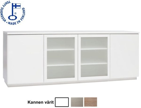 - Upea kotimainen Moderni ja laadukas Anton sarjan senkki neljällä kaapilla joissa kaikissa kaksi korkeussäädettävää hyllyä. Anton on valmistettu vahvasta VTT.n hyväksymästä E1-luokan MFC-kalustelevystä. Laadukas melamiinipinnoite on erittäin valonkestävä, joten kaluste pitää hyvin värinsä. Laatikoissa ja ovissa laadukkaat push-open mekanismit. Tuote toimitetaan valmiiksi kasattuna, sokkeli irrallaan, helppo ruuvata paikalleen. Lisätarvikkeista voidaan lasikaappeihin tilata valaisimet.