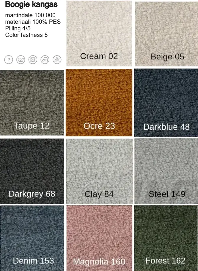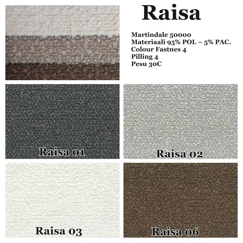 • Sohva on verhoiltu laadukkaalla sileäpintaisella Connect  kankalla tai Boogie chenille kankaalla. Kolmantena kangasvaihtoehtona on buccle kangas Raisa  jonka upea nukkapinta viimeistelee sohvasi. Sohvaa on saatavana myös muilla kankailla. Ota silloin yhteyttä asiakaspalveluumme.