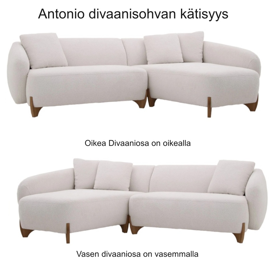Antonio divaanisohva on moderni ja muunneltava valinta, jossa itsenäisillä jaloillaan seisovat moduulit mahdollistavat juuri sinun tilaasi sopivan kokonaisuuden. Laadukkaat materiaalit, pussijousituksen tuoma erinomainen istuttavuus ja kestävät verhoilukankaat tekevät siitä trendikkään ja pitkäikäisen valinnan kotiin.