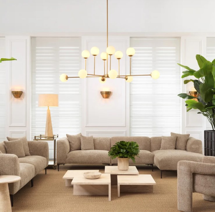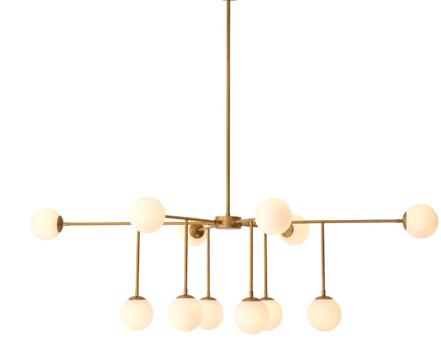 Aram kattovalaisin yhdistää messingin sävyisen rungon ja kaksitoista valkoista lasipalloa, luoden näyttävän ja elegantin kokonaisuuden, joka viimeistelee tilan modernilla ilmeellä. Valaisimen harmoninen muotoilu toimii sekä sisustuselementtinä että tehokkaana valonlähteenä.
