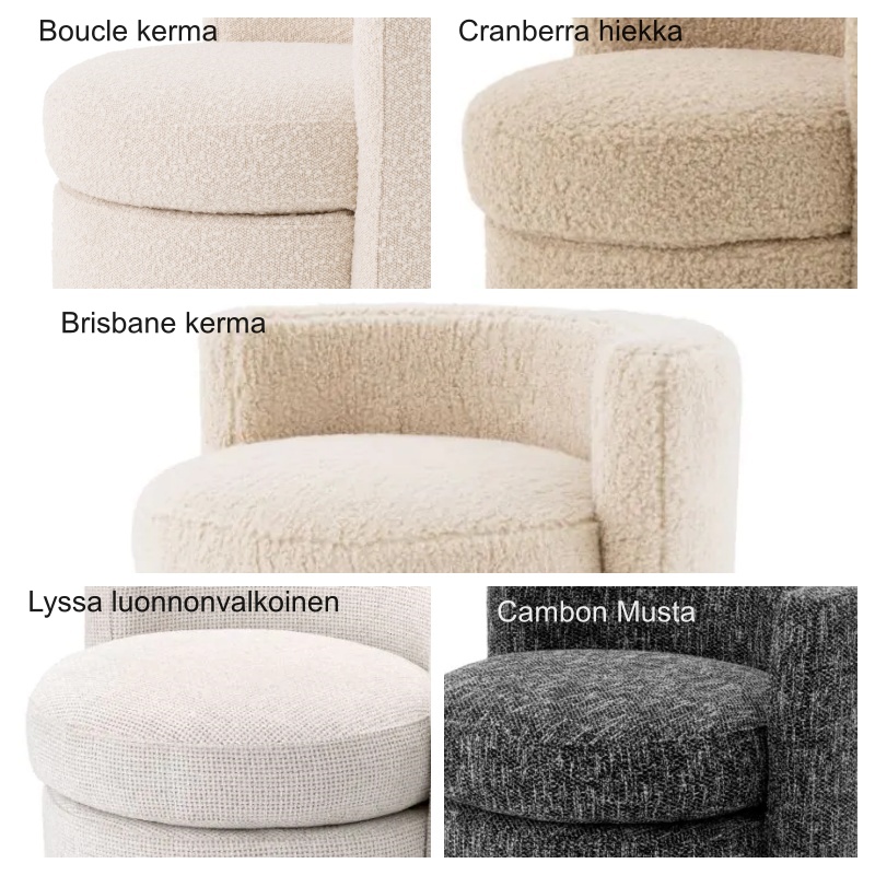 Saatavilla kuudessa upeassa värissä — harmaa, sininen ja vihreä sametti, boucle-kerma, Cambon musta sekä Lyssa luonnonvalkoinen — Arcadia-nojatuoli mukautuu saumattomasti erilaisiin sisustustyyleihin. Pehmeät, korkealaatuiset materiaalit tuovat tilaan lämpöä ja tyylikästä tekstuuria.
