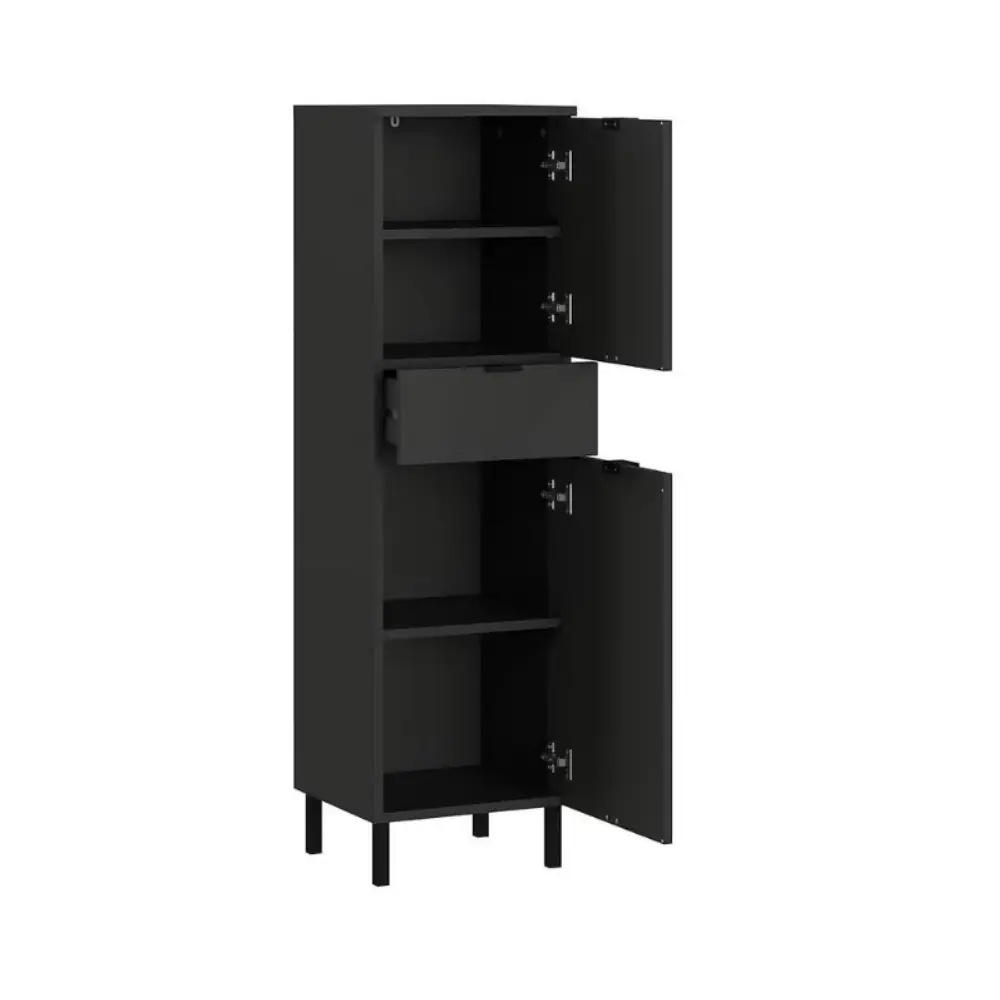 Yksi vetolaatikko ja kaksi kaappia tarjoavat runsaasti säilytystilaa pyyhkeille, pesuaineille ja muille kylpyhuonetarvikkeille. Korkeussäädettävät hyllyt mahdollistavat sisätilan muokkauksen omien tarpeiden mukaan, mikä tekee kaapista erittäin monipuolisen.