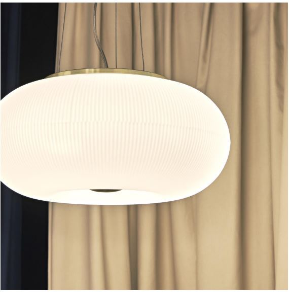 Kaunis ja moderni Arizona riippuvalaisin on elegantti yhdistelmä messinkiviimeisteltyä metallirunkoa ja valkoista happosyövytettyä puhallettua lasia. Lasikuvun kohokuvioidut koristeraidat luovat valaisimeen hienovaraista elävyyttä ja tuovat tilaan pehmeää, miellyttävää valoa.