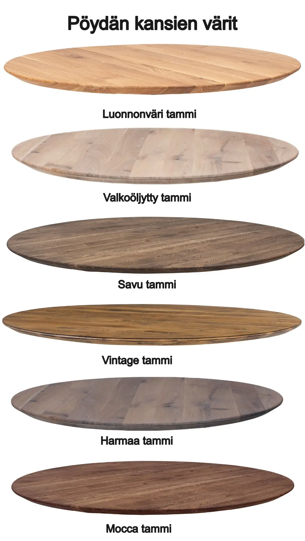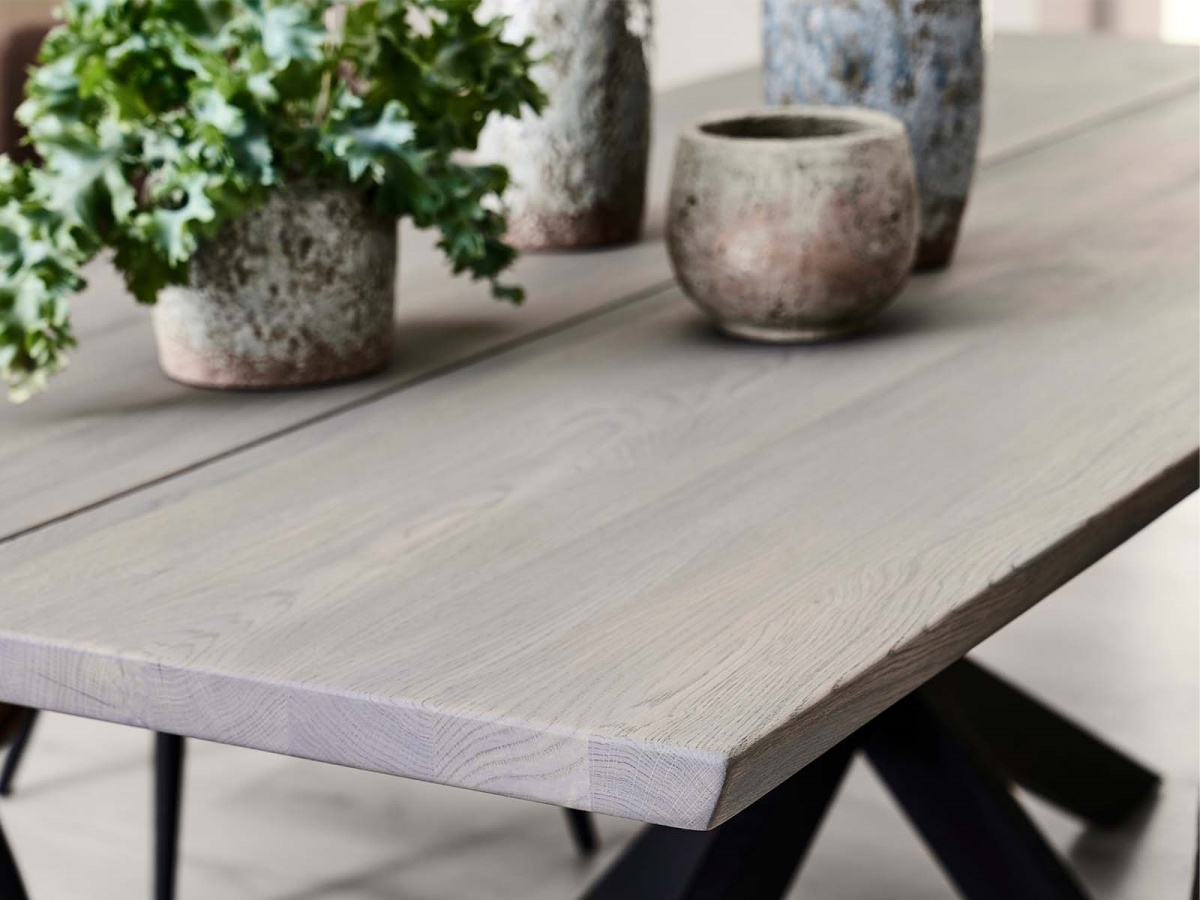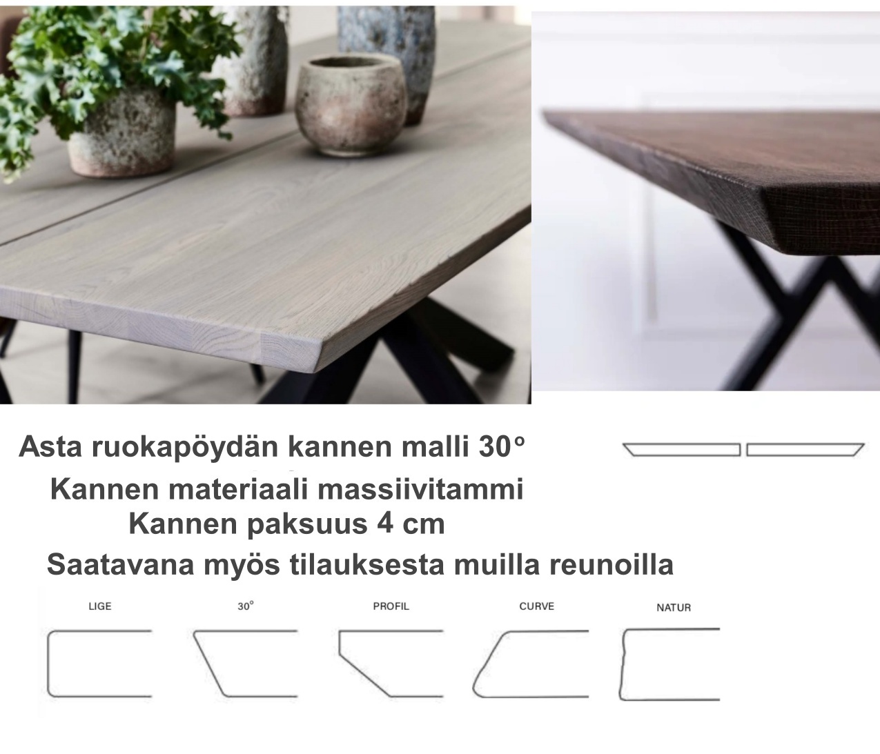 Asta ruokapöydän 4 cm paksu massiivitammesta valmistettu kansi on käsitelty öljyllä ja lakalla, mikä korostaa puun luonnollista kauneutta ja parantaa kestävyyttä. Kansi on saatavana kuudella eri öljykäsittelyn sävyllä, ja pöytään on mahdollista valita myös muita jalkavaihtoehtoja lisähinnasta oman sisustustyylin mukaan.