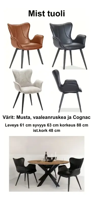 Lisävarusteena saatava hoitoöljy auttaa pitämään pöydän pinnan kauniina ja hyväkuntoisena vuosien ajan. Massiivipuulle ominaiset kosteuden ja kuivuuden vaihteluista johtuvat halkeamat ovat normaaleja ja tarvittaessa helposti korjattavissa puukitillä, ja kokonaisuuden voi täydentää lisähinnasta saatavilla Mist-ruokapöydän tuoleilla.