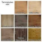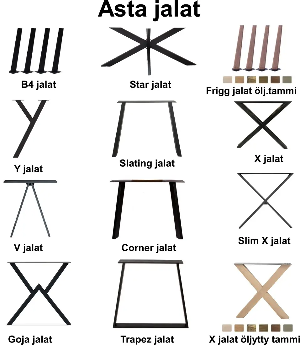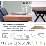 Asta ruokapöydän 4 cm paksu massiivitammesta valmistettu kansi on käsitelty öljyllä ja lakalla, mikä korostaa puun luonnollista kauneutta ja parantaa kestävyyttä. Kansi on saatavana kahdeksalla eri öljykäsittelyn sävyllä ja pöytään on mahdollista valita mattalakkaus saadaksesi pöydän kanteen vielä kestävämpi pinta.