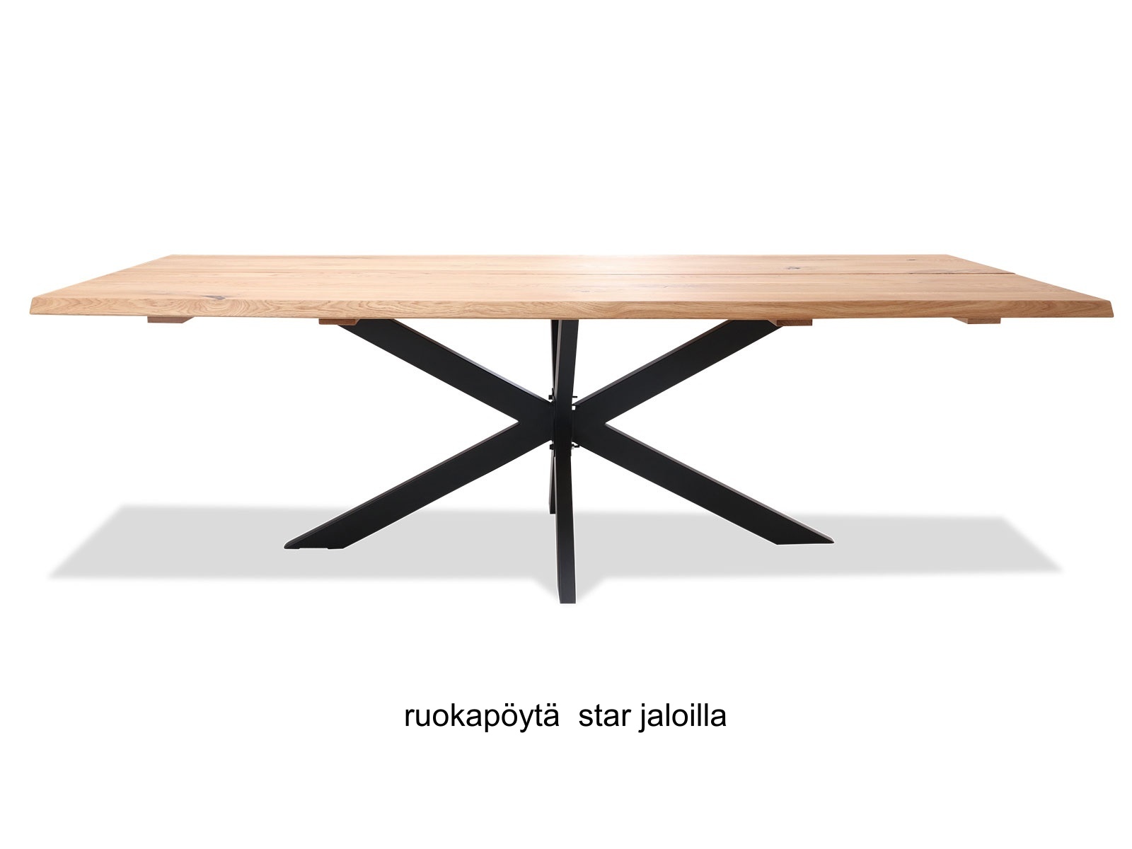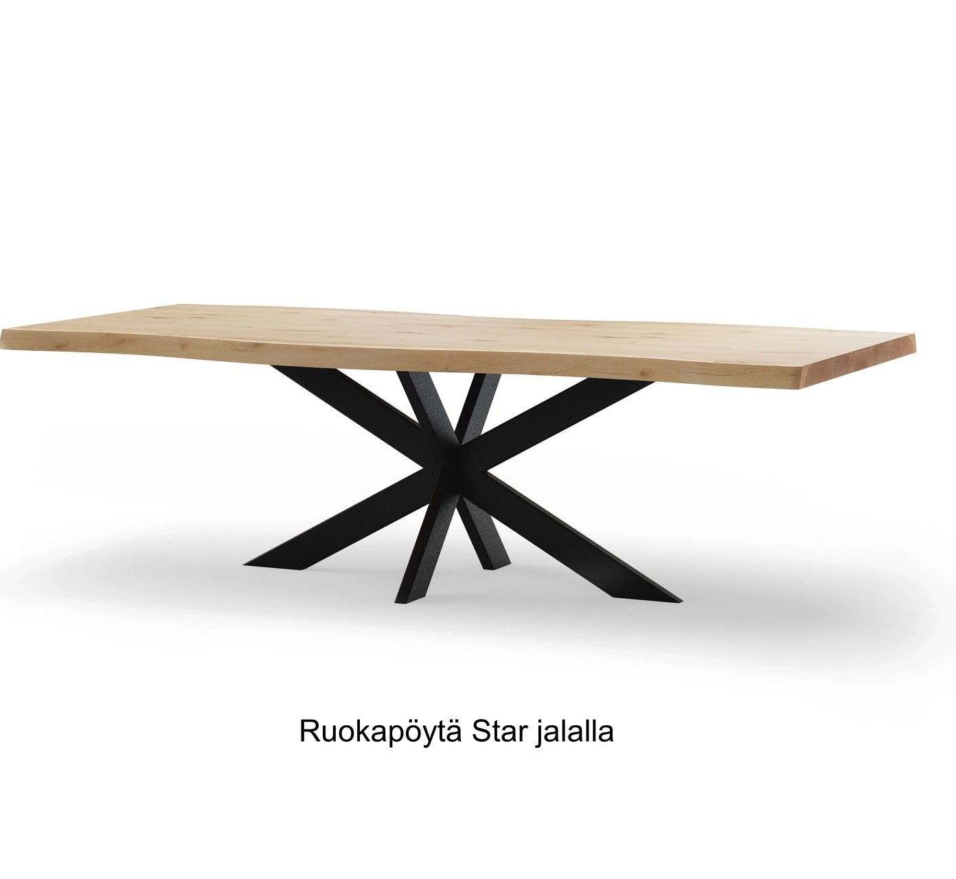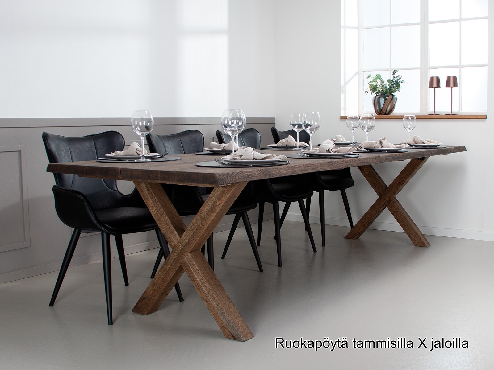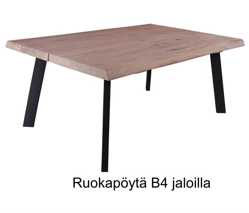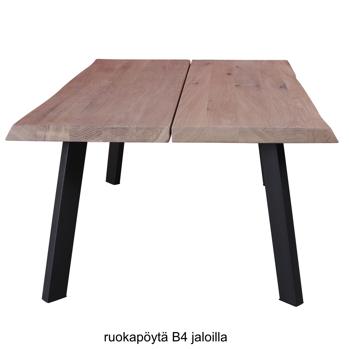 Asta ruokapöytä B4 mustilla jaloilla on tyylikäs ja laadukas valinta, joka tuo ruokailutilaan modernia ilmettä ja massiivipuun arvokkuutta. Mustat B4-jalat luovat vahvan kontrastin tammikannelle ja tekevät pöydästä näyttävän katseenvangitsijan niin arkeen kuin juhlaan. Voit lisähinnasta valita pöydälle toiset jalat joko metallisena oman sisustustyylin mukaan tai puisena. Voit myös valita ruokailupöydän reunaksi toisen vaihtoehdon jos et pidä tästä lankkupöydän reunasta ja pöytää on saatavana myös jatkettuna.