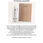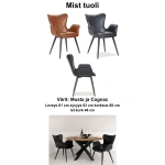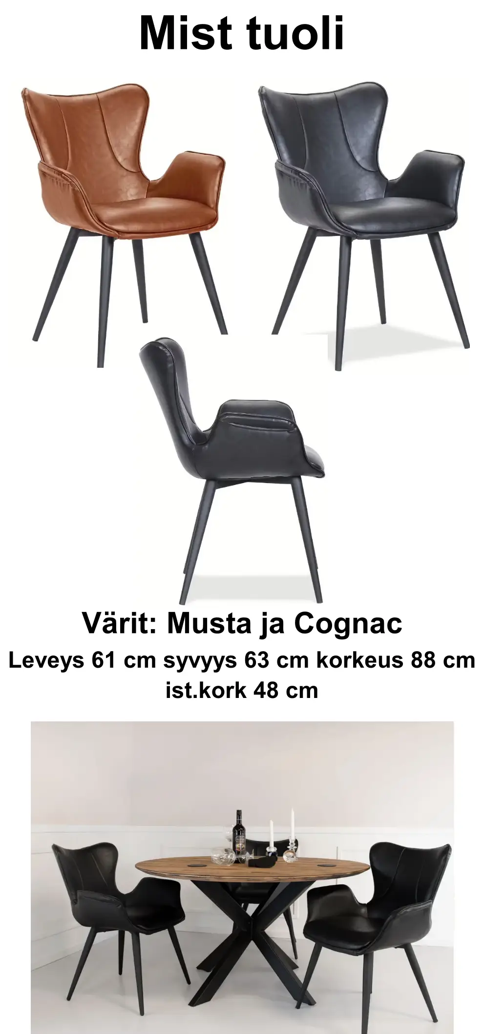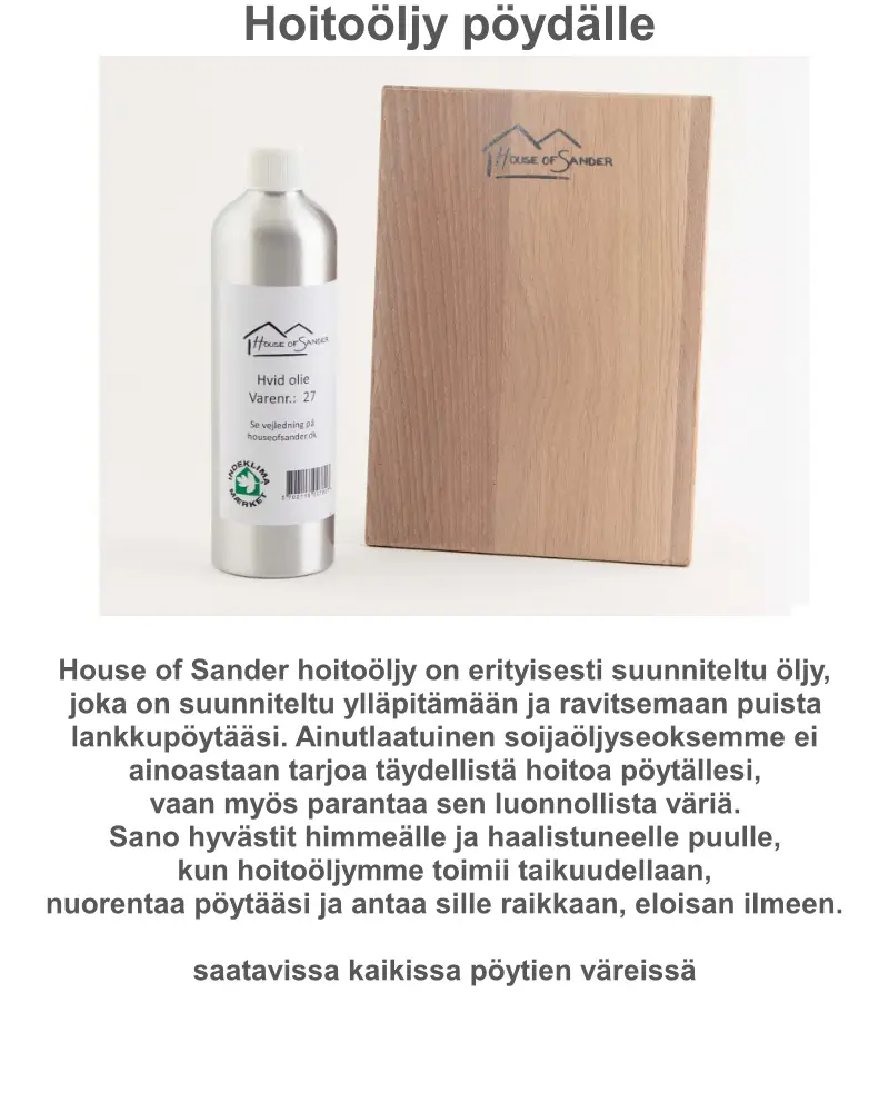 Lisävarusteena saatava hoitoöljy auttaa pitämään pöydän pinnan kauniina ja hyväkuntoisena vuosien ajan. Massiivipuulle ominaiset kosteuden ja kuivuuden vaihteluista johtuvat halkeamat ovat normaaleja ja tarvittaessa helposti korjattavissa puukitillä, ja kokonaisuuden voi täydentää lisähinnasta kuvan Mist-ruokapöydän tuoleilla.