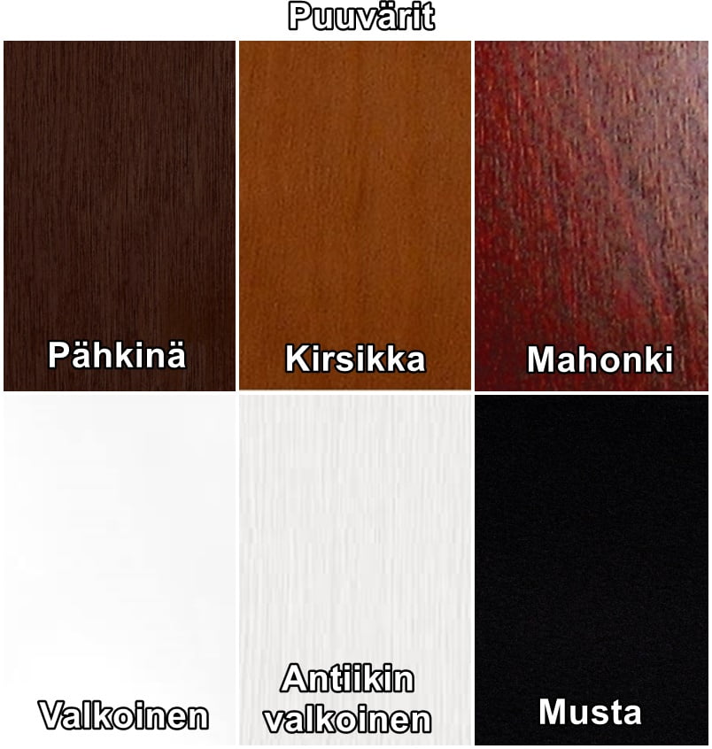 Pähkinä, saatavana tilauksesta myös kirsikka, mahonki, mustilla tai valkoisilla puilla – ota silloin yhteyttä asiakaspalveluumme.