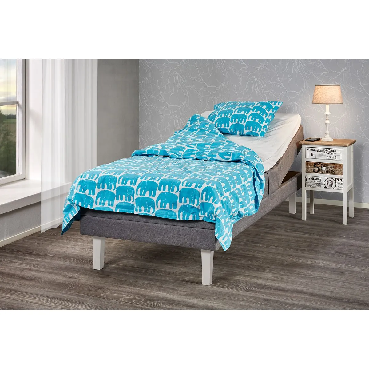Base-moottorisängyssä on tukeva massiivipuurunko ja valkoiset puujalat, jotka tuovat makuuhuoneeseen raikkaan ja ajattoman ilmeen. Harmaa Malmö-huonekalukangas on kulutusta kestävää ja helppo yhdistää eri sisustustyyleihin. Sängyn kokonaiskorkeus on 58 cm ja petauspatjan korkeus 7 cm, ja sekä petauspatja että jalkasarja sisältyvät hintaan – valmis paketti laadukkaaseen ja ergonomiseen uneen.