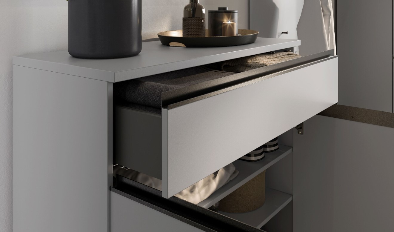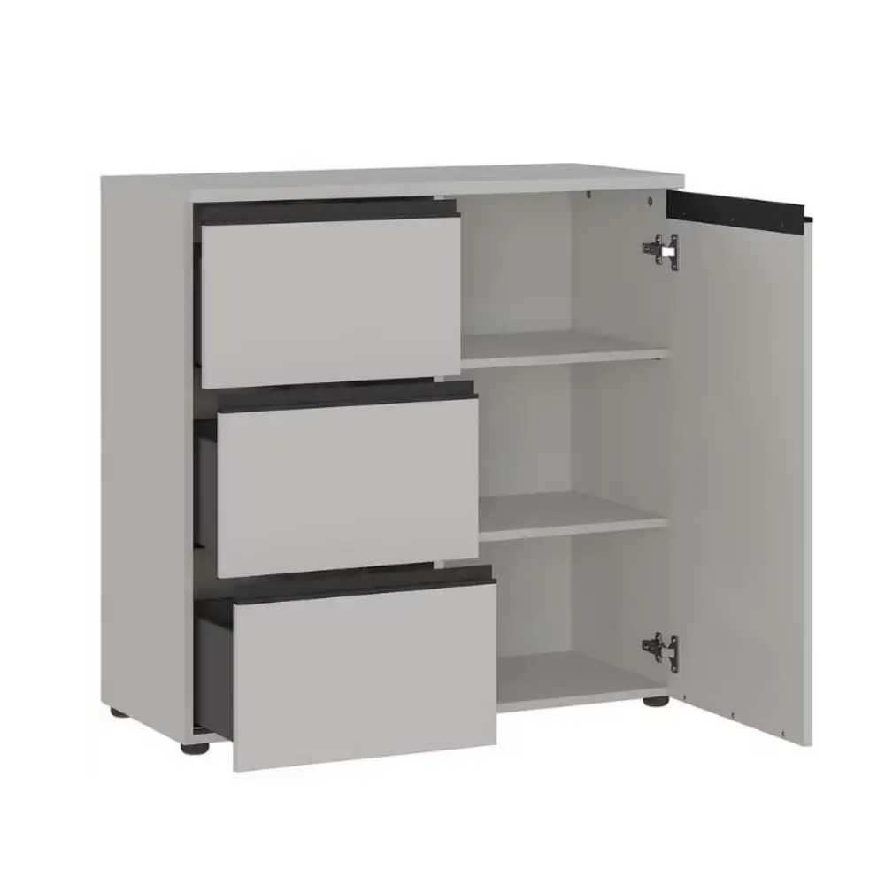 Kaapin vetolaatikko ja kaksi ovellista kaappia tarjoavat runsaasti säilytystilaa kengille, asusteille ja arjen tarvikkeille. Korkeussäädettävät hyllyt mahdollistavat sisätilojen joustavan muokkauksen, jotta kaikki tavarat löytävät vaivattomasti paikkansa.
