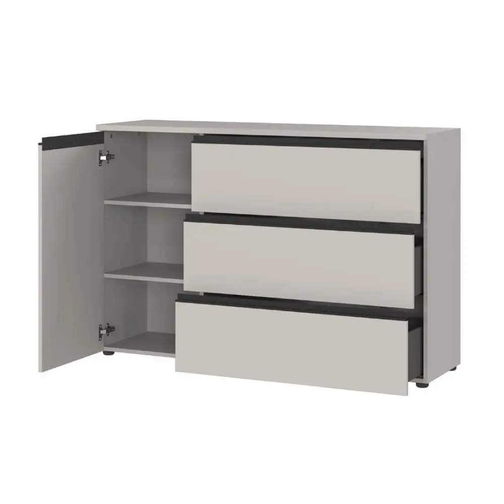 Käytännöllinen vetolaatikko sekä kaksi ovellista kaappia tarjoavat runsaasti tilaa arjen tavaroille, kengille ja asusteille. Korkeussäädettävät hyllyt mahdollistavat sisätilojen joustavan muokkauksen, jotta säilytystila palvelee juuri omia tarpeitasi.
