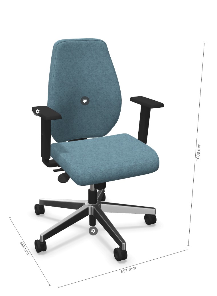 Tuolissa on säädettävä selkänojan kallistus, synkronoitu istuin–selkänoja-mekanismi, istuinsyvyyden ja -korkeuden säätö sekä Anti-Shock -ominaisuus selän suojaamiseksi. Vahva kaasujousi ja muovi- tai alumiiniristikko takaavat tukevuuden, ja pyörät ovat suunniteltu koville lattioille.