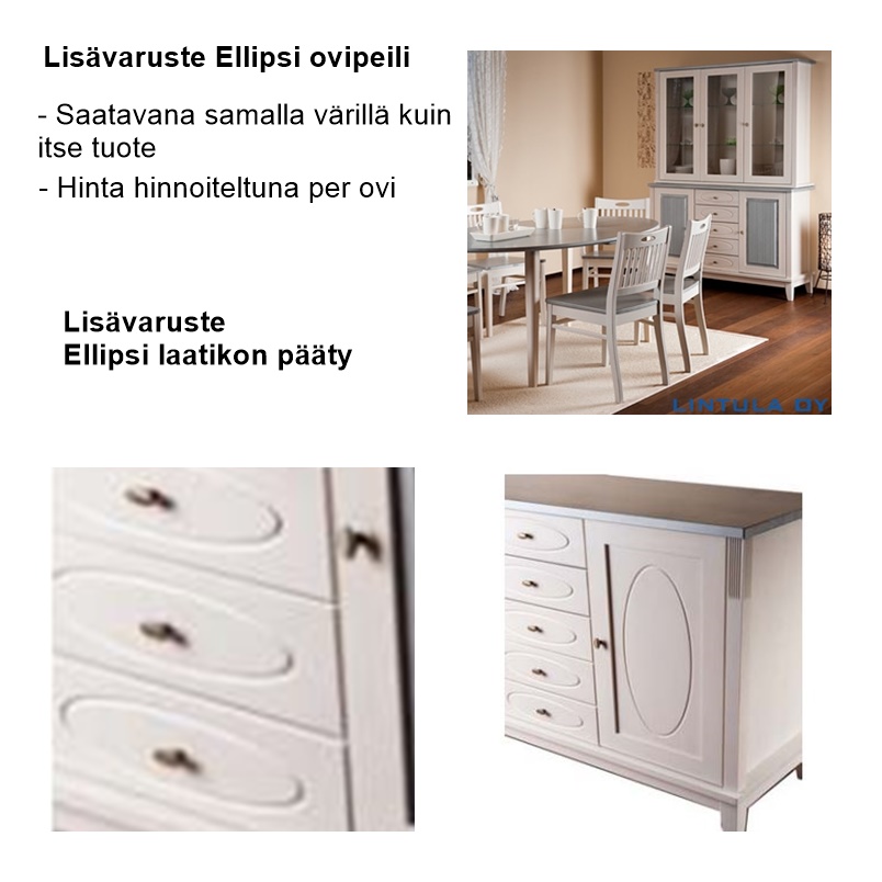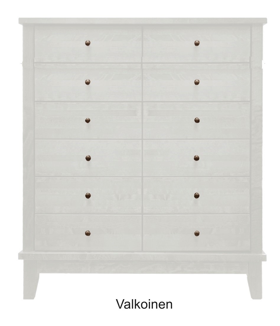 Lipasto toimitetaan sileillä laatikoilla, mutta lisähinnasta voit tilata ellipsimalliset etusarjat yksilöllistä ilmettä varten. Värityksen voi valita yksivärisenä tai kaksivärisenä – esimerkiksi eri sävyisin kansin, rungoin tai jaloin – jolloin lipasto mukautuu täydellisesti kotisi tyyliin.